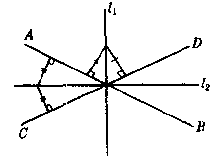 推论 和两条相交的已知直线距离相等的点的轨迹,是这两条直线所成两组对顶角的平分线.如图4,l