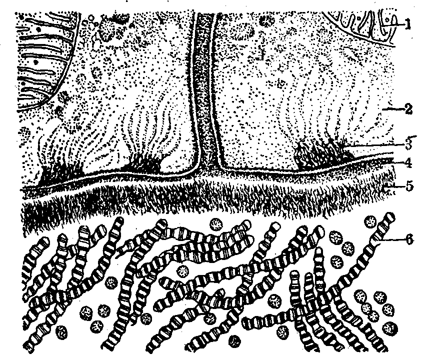 释义 | 基膜basement membrane又称基底膜。动物上皮组织与结缔组织界面的薄膜。该膜还包围脂肪细胞、肌细胞及许旺细胞四周。光镜下不易分辨。电镜下可见由基板、网板和基质构成。基板邻接上皮细胞是上皮分泌的产物,包含细丝交织的密网和分布网眼中的糖蛋白等均质状基质。网板位于基板下方,由成纤维细胞产生的网状纤维和基质构成。有些部位上皮基膜很薄,只见基板而网板不明显。现趋向于将基板作为基膜的同义词。功用在作为上皮细胞依附面和进行物质交换的半透膜,并使上皮与结缔组织牢固相连。 基膜basementmembrane介于上皮基底部与结缔组织之间的1层薄膜叫基膜。上皮组织依靠此膜牢固地附于结缔组织上。基膜的厚度可因上皮的类型不同而有差异。此膜是一种半透性薄膜,有选择性的使某些物质透过。其组成成分为粘多糖蛋白和网状纤维(称网质板)。有些免疫复合物可沉积在某些脏器的基膜上,发生相应病理改变。 基膜 基膜基膜也称基底膜,光镜下,是位于上皮组织和结缔组织交界面的薄膜。早年研究推测,此膜由结缔组织基质和网状纤维组成,厚度不一,复层鳞状上皮和气管假复层纤毛柱状上皮的较厚,其它上皮的相当薄。肾血管球毛细血管的基膜很厚。眼晶状体的被囊很厚,其性质也属基膜。上皮的基膜于普通染色时不易辨认,用PAS反应或浸银法能清楚染出。近年研究表明,基膜不是一个单层的膜,是由二、三层组成,但光镜下不能分辨。电镜下,它的主要成分是3~4nm直径的丝交织成的密网和均质的基质,厚50~100nm,称基板(见图)。基板的外面还有纤细的网状纤维和基质组成的网板(见图),厚薄不定。基板、网状纤维和基质共同组成了光镜所见的基膜。浸银法染出的是此膜中的网状纤维,PAS反应主要显示基板和网板的多糖。有些上皮的基膜很薄,只见基板,不见明显的网板,故现时趋于将基板作为基膜的同义词,基膜一词渐少使用。肌细胞、神经纤维和一些别的细胞外面也包被一层与基板相似的物质,称基板或外板。生物化学分析表明,基板的丝为Ⅳ型胶原蛋白,基质含糖蛋白和粘多糖。有证据说明,基板是上皮细胞的产物,网板由成纤维细胞产生。 基膜与半桥粒模式图 1.线粒体 2.张力丝 3.半桥粒 4.细胞衣5.基板 6.网板 基膜使上皮与结缔组织牢固连接,并成为上皮细胞进行物质交换的半透膜。此膜还有别的功能,但尚未深入了解。它可能是上皮细胞移动的依附面。它也有保持组织正常形态和结构的作用。除去胚胎发生期唾液腺的基膜,则不能长成正常腺的结构。肾血管球的基膜是血液滤过的重要屏障,能阻止大分子物质滤出。基膜对组织的生长、分化和再生有相当的作用。肌肉或上皮受损伤时,此膜起支持作用,使再生的细胞沿此膜生长。某些恶性肿瘤没有基膜,或基膜破裂,肿瘤细胞易于转移。 ☚ 质膜内褶 腺 ☛ 基膜 基膜basement membrane是心肌细胞膜外面的一层均质性透膜,是糖蛋白等的凝结物。与结缔组织相连,具有支持细胞,防止擦伤和半渗透性滤膜的功能。 ☚ I带 肌浆 ☛ |
