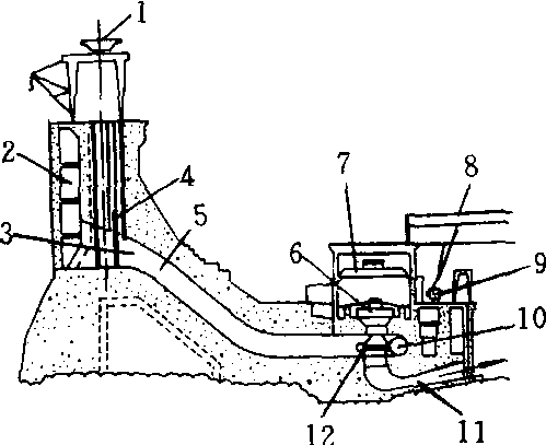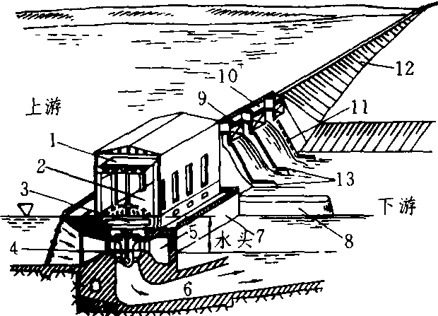 释义 | 堤坝式水电站hydroelectric station with dam用闸坝拦截河流,抬高上游水位以形成水头的水电站。按厂房位置分为河床式(图1)和坝后式(图2)两种。河床式水电站建筑物常由挡水的非溢流坝段、溢流坝段及厂房组成,有的还有其他部门用的建筑物。这种电站通常适用于水头小于30~40 m。当水头更高时,厂房已不适于承受上游过大的水压力,宜采用坝后式水电站,其组成建筑物与河床式类似,但厂房不挡水,设于坝的下游侧。由深式进水口、压力管道、蜗壳、水轮机转轮和尾水管形成发电水流的通道。 图1 河床式水电站 1.起重机 2. 主机房 3.发电机 4. 水轮机 5.蜗壳 6.尾水管 7.水电站厂房 8. 尾水导墙 9. 闸门 10. 桥 11. 混凝土溢流坝 12.土坝 13. 闸墩 图2 坝后式水电站 1. 门式起重机 2. 栏污栅 3. 深式进水口 4. 闸门 5. 压力管道 6. 发电机 7. 桥式起重机 8. 输电线 9. 主变压器 10.蜗壳 11.尾水管 12.水轮机 堤坝式水电站dam-type power station |