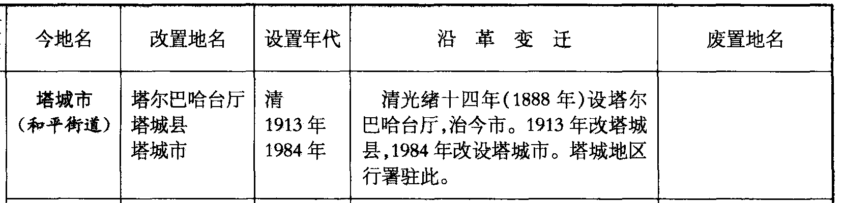 塔城市(和平街道)塔尔巴哈台厅塔城县塔城市清1913年1984年清光绪十四年(1888年)设塔尔巴哈台厅,治今市。1913年改塔城县,1984年改设塔城市。塔城地区行署驻此。