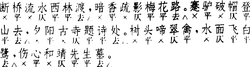 塞鸿秋 塞鸿秋张可久 小令  全曲七句:7 △,7 △。7 △,7 △。5,5 △,7 △。与〔叨叨令〕句式相同,仅第五、六定格句改作五字对句。凡叶韵处皆须作平平去。第五句平仄有变化,如无名氏作:“转过海棠轩,映着荼蘼架。”周德清作:“晚云都变露,新月初学扇。”第五句有叶韵者,如张可久他作:“扁舟范蠡高,五柳陶潜傲。”小令兼用。套数不常用。《广正》谓可借入〔仙吕〕及〔中吕〕,惟都注“缺”,指缺少实例。 ☚ 叨叨令 脱布衫 ☛ 塞鸿秋 塞鸿秋曲牌名。属北曲正宫(亦入仙吕宫和中吕宫)。字数定格及韵式据清·周祥钰《九宫大成谱》作七、七、七、七、五、五、七(七句)。与〔叨叨令〕相比,除不用“也么哥”三字之外,其余的句式、平仄均同。近人吴梅《南北词简谱》注称:该曲第四、五、七句的第三四字宜作去上,“夜守、梦里、范蠡,俱去上声,宜从。”该调可用作小令,如元·张小山 《道情》“直钩曾下严滩钓”一曲即是。亦可用于套曲中。 ☚ 呆骨朵 醉太平 ☛ 00002551 |