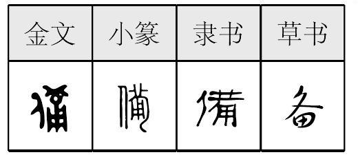 ❹才能兼备|德才兼备|攻其不备|求全责备|文武兼备|形神兼备|掩其不备 备bèi (甲) (金) (篆) 甲骨文像一支箭装在箭袋子里,意思是做好射箭的准备。后发生讹变,繁体为“備”,简体字与夂(脚)无关,与田也无关,属记号字。作声符生成的字有: bèi 惫(疲惫) 鞴(鞴马)