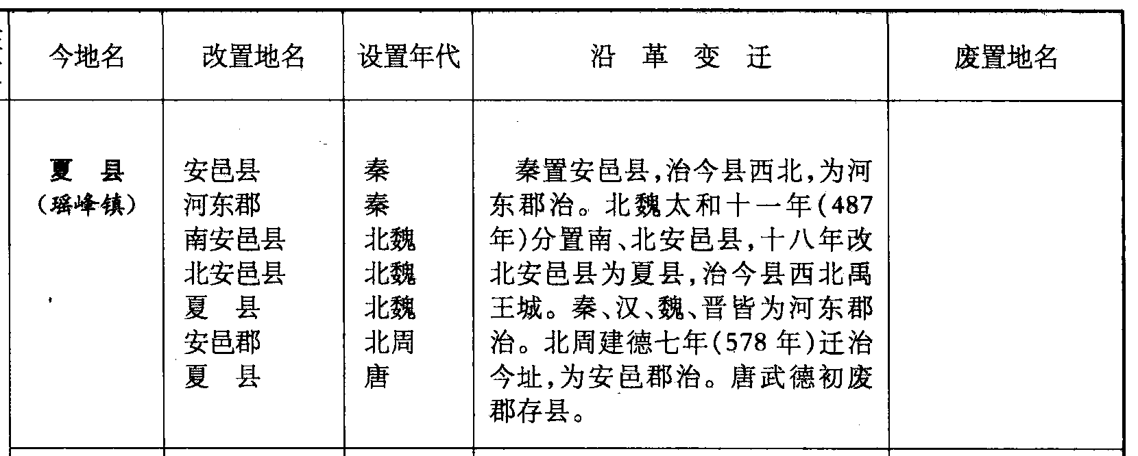 夏县(瑶峰镇)安邑县河东郡南安邑县北安邑县夏县安邑郡夏县秦秦北魏北魏北魏北周唐秦置安邑县,治今县西北,为河东郡治。北魏太和十一年(487年)分置南、北安邑县,十八年改北安邑县为夏县,治今县西北禹王城。秦、汉、魏、晋皆为河东郡治。北周建德七年(578年)迁治今址,为安邑郡治。唐武德初废郡存县。