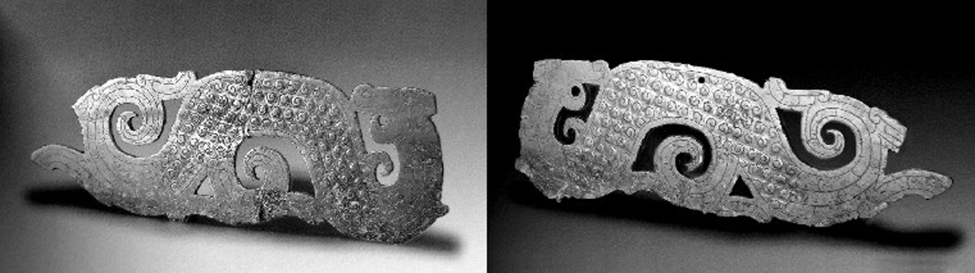 释义 | 夔龙玉佩 夔龙玉佩西周早期。长8.9厘米,厚0.2厘米。1979年山东省滕县庄里西村出土。山东省滕县博物馆藏。玉质为青白色,佩雕成夔龙形,身体弯曲,两侧有弧形脊刺,似处于游动状态。两面均以双钩线饰尾部相交的两条夔龙,线条流畅,灵活自然。两端凸脊处各有小孔,可系绳佩带。这种形制的玉佩西周时期较为少见。 ☚ 鸟纹玉刀 玉鹰 ☛ 夔龙玉佩 夔龙玉佩kuilonɡ yupei战国晚期玉器。1988年咸阳市文物普查时旬邑县马栏乡(今马栏镇)转角村秦人瓦椁墓葬出土。1对,青玉雕琢,长27.5厘米,宽8.3厘米,厚0.5厘米。为透雕扁平体,腹有一孔作佩系用。龙身修长,呈S形曲身回首卷尾状,有一足。龙鼻、嘴、足和尾巴系透雕,含蓄、洗练地刻划出龙躯体流动的曲线美,通体浅雕谷纹。现藏旬邑县博物馆。 ☚ 夔龙方座簋(甲) 夔纹半瓦当 ☛ |