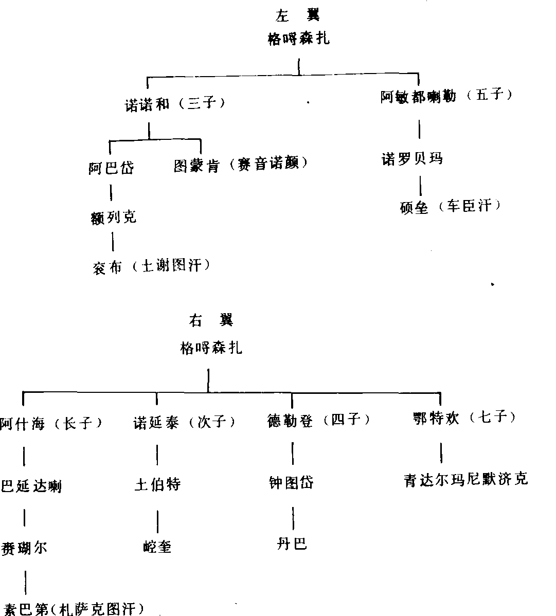 释义 | 外七鄂托克喀尔喀明代东蒙古喀尔喀(罕哈)万户之一部分。亦译外喀尔喀七部,向称外喀尔喀。正德五年(1510),达延汗统一东蒙古六万户,不久将喀尔喀万户西部地区及属民(即外喀尔喀)封予第十一子格哷森扎(格列山只台吉)。后由其7子分领,分左右翼,分布于哈勒哈河以西的漠北地区。至格哷森扎孙阿巴岱,于万历十五年(1587)称“瓦齐尔汗”。明末,形成为土谢图汗、车臣汗和札萨克图汗三大领主。崇德三年(1638),三汗向皇太极进※九白之贡,臣属清朝,通称喀尔喀蒙古。世系如下: |