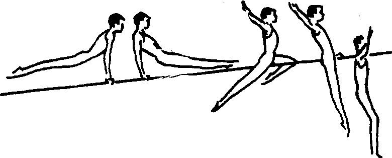 杠上外侧坐,利用腿压杠及杠的反弹力,使身体向前侧挺身跳下的动作。动作要领:左腿后部坐杠,小腿后屈,右腿伸直后举,成两腿在右杠外侧的前后分腿坐杠姿势,左手换握在左膝前的杠上,右臂侧举,左腿压杠,同时伸髋,左腿伸直与右腿并拢,左臂伸直用力撑杠,伸直身体向前跳下。