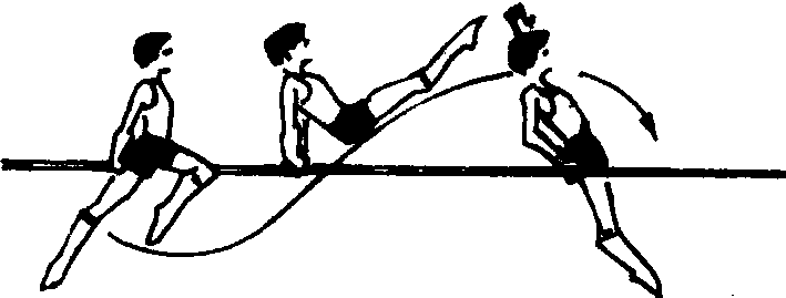 由杠外侧坐姿势开始,借助杠反弹力和臂支撑力,两腿摆越两杠挺身落下的动作。