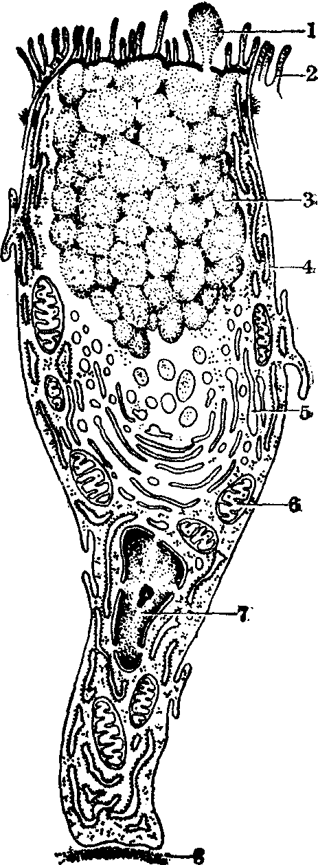 释义 | 外分泌腺exocrine gland又称有管腺。动物体内直接将分泌物释放到上皮表面或导管的腺。腺体主要由分泌部和导管组成。分泌部细胞合成和释放分泌物,导管与分泌部相连,将分泌物送入器官腔中或体表。可按几种标准分类,故对某个腺而言,它可分属于不同类别。仅一个细胞构成的腺称单细胞腺,多个细胞组成者称多细胞腺;依导管有无分枝称单腺和复腺;按分泌部形态分为管状腺、泡状腺、管泡状腺等。有些外分泌腺是单独存在的器官,有些附属于某种器官,或散于上皮之中。 外分泌腺exocrine gland又叫有管腺,系分泌腺的一大类。此腺体所分泌的液体物质经过管道流入体腔或达体表。人体外分泌腺很多,如腮腺、舌下腺、颌下腺、胃腺、肠腺、胰腺、汗腺等。有单细胞腺,亦有多细胞腺,腺细胞多为立方上皮细胞。外分泌腺的分泌液对人体新陈代谢有重要作用,腺体发生病变可引起相应的疾病。 外分泌腺见“腺”。 外分泌腺 外分泌腺指分布于人体一定部位有导管的腺体,故又称有管腺。其分泌物借导管输送到体表或体腔。外分泌腺可分为单细胞腺和多细胞腺。单细胞腺分散于被复上皮细胞之间,如消化道和呼吸道粘膜内的杯状细胞,它分泌的腺液排到器官表面,具有保护作用。多细胞腺又可分为腺区和腺体。由单细胞集结占据一定区域的多细胞腺称腺区,如胃腺,它分泌的腺液含有消化酶,具有消化食物和杀菌等作用。腺区的细胞大量增殖以致使器官表面不能容纳,而移入器官深部或穿出器官壁以形成腺器官,这种多细胞腺称腺体,如汗腺、唾液腺、胰腺和肝脏等。腺体分泌的腺液通过导管排到器官表面,以完成有关的生理功能。 ☚ 内分泌 内分泌腺 ☛ 外分泌腺exocrine gland亦称有管腺。其分泌物由导管输送至身体表面或体内的管腔囊中。有的仅为一个细胞构成,称单细胞腺,如杯状细胞;但多数是由多个细胞构成,称多细胞腺,如汗腺。多细胞腺分导管部和分泌部。根据分泌部的形态,可将其分为管状腺、泡状腺和管泡状腺。根据分泌的性质,又可分为粘液腺、浆液腺和混合腺。 外分泌腺 外分泌腺外分泌腺也称有管腺,主要由腺上皮构成的分泌部和导管组成。分泌部的细胞合成和释放分泌物。导管与分泌部通连,将分泌物排到器官腔或身体表面。有些腺的导管细胞也有分泌或吸收作用。许多外分泌腺为小腺,附属于器官内,如消化管道、呼吸管道、泌尿和生殖管道和皮肤中的腺。有些是较大的腺,为单独存在的器官,如肝、胰、唾液腺、前列腺、精囊、尿道球腺、前庭大腺和前庭小腺等 有些器官粘膜上皮中有散在的分泌粘液的杯形细胞。胃粘膜上皮细胞大多都分泌粘液,也属外分泌腺。汗腺和肾排出代谢产物,睾丸产生精子,也常列为外分泌腺。外分泌腺分泌物的性质不一,有蛋白质、肽、糖、脂类、无机盐和水分等。这些物质排出后大多起特定的作用。分泌物的合成和释放有的受自主神经的调节,有的受激素的调节,有的同时受二者调节。 图1 杯形细胞超微结构 1.粘原颗粒 2.微绒毛 3.粘原颗粒 4.粗面内质网 5.高尔基复合体 6.线粒体 7.细胞核 8.基板 (2)按导管是否分支和分泌部的形状: 按导管是否分支可分单腺和复腺。单腺的导管不分支(图2),又按分泌部形状分为: ❶单管状腺:腺呈直管状,设有导管,小肠和大肠的肠腺(也称Lie-berkühn隐窝)属于此类; ❷单曲管状腺: 分泌部为长而盘曲的管,导管直而长,汗腺和耵聍腺属于此类; ❸单分支管状腺: 分泌部为管状并分支,末端常弯曲,有的无导管,如胃腺和子宫腺;有的有短导管,如口腔的一些小腺、舌腺、食管腺和十二指肠腺; ❹单泡状腺: 分泌部呈圆形或长圆形,导管不分支,哺乳类和人无此种腺,如分泌部有分支,或有多个腺泡通入一个导管,称单分支泡状腺,如皮脂腺和眼睑的睑板腺。 图2 各种外分泌腺模式图 1.单管状腺 2.单泡状腺 3.单管泡状腺 4.单分支管状腺 5.单分支管泡状腺 6.单分支泡状腺 7.复管状腺 8.复泡状腺 9.复管泡状腺 复腺的导管有分支(图2),根据分泌部的形状分三种: ❶复管状腺: 分泌部为弯曲的管并常分支,口腔的一些纯粘液腺、贲门腺、十二指肠腺的一部分、尿道球腺和肾小管属于此类; 睾丸也可列入此类; ❷复泡状腺: 分泌部呈圆形或长圆形,因以长圆形的较多见,故应称复管泡状腺,唾腺、胰腺和呼吸道的腺属于此类; ❸复囊状腺:分泌部为较大的圆形并有大腔,泪腺、乳腺和前列腺属于此类; 因分泌部呈长圆形的较多见,故有人将这些腺列为复管泡状腺;这些腺常不汇成一个总导管,而由多个导管导出。 (3)按腺合成的分泌物性质:分粘液腺、浆液腺和混合腺。这个分类只适用于一部分腺。 ❶浆液腺: 分泌部呈圆形和长圆形,腔小,由浆液性细胞组成,称浆液性腺泡。细胞多呈锥形,于HE染色时,胞质显嗜碱性,基底部着色更深。胞核圆或长圆,位于细胞近基部,着色较浅,常见较清楚的核仁。细胞顶部常见许多分泌颗粒,称酶原颗粒,显嗜酸性,特殊染色时易见。电镜下见细胞基部有丰富的粗面内质网。线粒体多,散在于细胞内。高尔基复合体发达,位于核上方。分泌颗粒密度不一,有膜包裹。细胞合成分泌蛋白,呈现明显的分泌周期。细胞摄取氨基酸,在粗面内质网合成多肽; 再输送到高尔基复合体,加工浓缩成有膜包裹的分泌颗粒,脱离高尔基复合体,移到细胞顶部。细胞释放分泌物时,分泌颗粒的膜