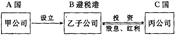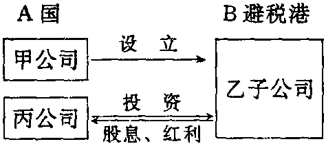 再如,A高税国的甲公司,欲在本国投资,为了避税,甲公司先在B避税港设立乙子公司,然后再以乙子公司的名义,返回A国投资设立丙公司。丙公司的税后利润,以股息、红利形式转移汇集到乙子公司处,以回避A高税国对股息、红利征税。如下图: