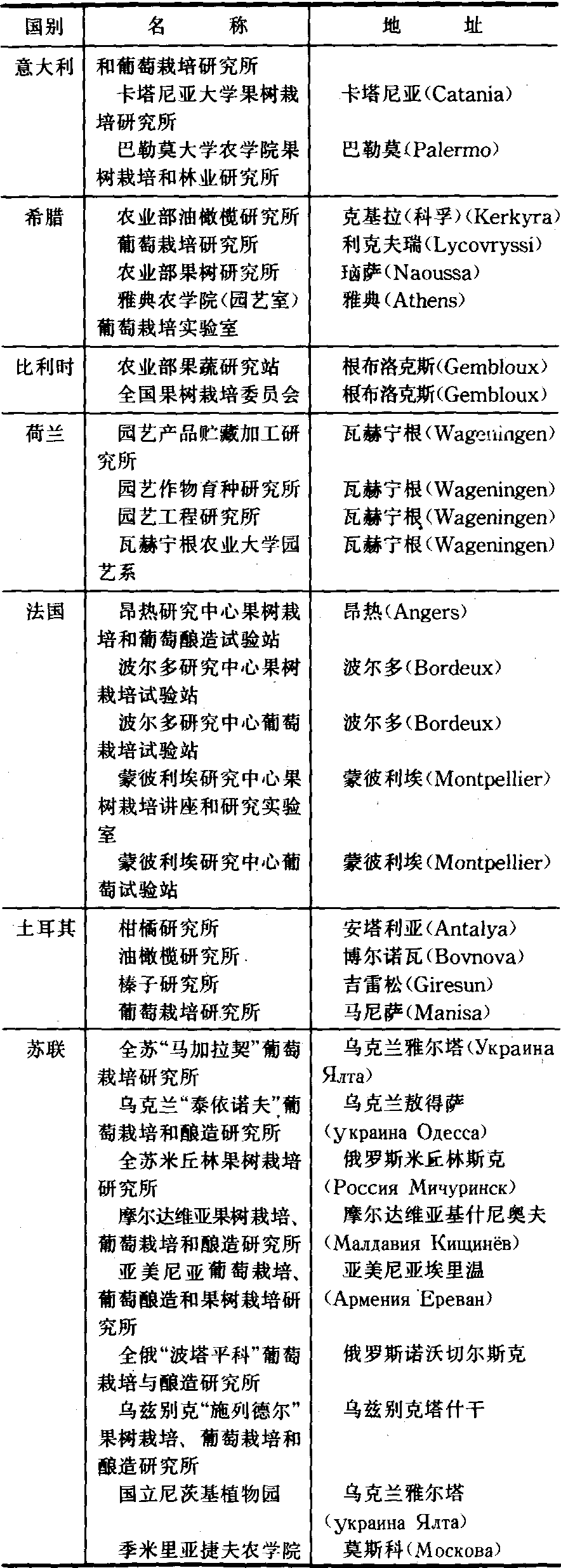 世界许多国家都设有专门从事果树科学研究的机构。列举20个国家主要从事果树科学研究的80多个单位(包括部分高等院校)见表: