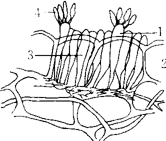 释义 | 外担菌属Exobasidium担子菌亚门,外担菌目,外担菌科。子实层平铺,灰白色,担子圆柱形或棍棒形,单胞,无色,担子间无侧丝,在寄主角质层下形成,后外露,偶尔有单个的担子从气孔伸出,小梗在担子上顶生,圆锥形,2~4个,无色,其上各生一个担孢子,担孢子倒卵形、椭圆形或肾脏形,无色,平滑,多寄生于叶和叶柄,引起膨肿。常见的有坏损外担菌 (E. vexansMass.),引致茶饼病;杜鹃外担菌(E.rhododendri Cram.),引致杜鹃饼病。 外担菌属 1.担子 2. 寄主细胞3. 子实层 4. 担孢子 |