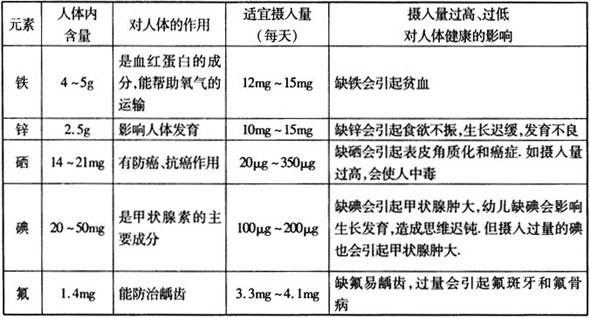 微量元素对人体正常生理代谢有重要的调节作用,人体缺少微量元素就会引起相应的病症.微量元素中有20多种是人体必需元素,还有一些是非必需元素,另一些为有害元素.即使必需元素也有一个合理摄入量的问题,因为摄入不足或摄入过量均不利于人体健康.如下表.