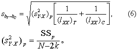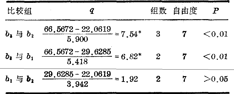 按式(1)得 查F界值表得0.05>P>0.01,按a=0.05水准拒绝H0,接受H1,可认为各组直线不重合,再分别进行回归系数间和截距间的假设检验。 (2)各样本回归系数的比较。 H0: 四个总体回归系数βi相等, H1: 四个βi不等或不全相等。 a=0.05。按式(2)得 查F界值表得P>0.05,按a=0.05水准不拒绝H0,可认为各βi相等。 (3)各样本截距的比较。 H0: 四个总体截距相等, H1: 四个总体截距不等或不全相等。 a=0.05。按式(3)得 查F界值表得0.05>P>0.01,按a=0.05水准拒绝H0,接受H1,可认为各截距不等或不全相等。即四条直线相互平行,但截距不等或不全相等。 多个样本回归系数的两两比较 经假设检验,几条直线的回归系数间若有差别,需要弄清是哪两条直线间有差别,哪两条间没有差别,可用回归系数间两两比较的q检验。方法与均数间两两比较相似,步骤如下: (1)作检验假设,H0为各总体回归系数两两相等,即βA=βB,A、B是任两个对比的组。 (2)按式(4)计算回归系数两两相差的标准误SbA-b ![]() 式中下标A、B为相互比较组的组号,下同。 (3)将回归系数由大至小排列,如依次为b4、b3、b2、b1,计算这些回归系数两两之差及其相应的所包含的组数。如比较b4与b3、b3与b2 、b2与b1时,组数为2;比较b4与b2、b3与b1时,组数为3;比较b4与b1时组数为4。 (4) 按式(5)计算q值。 (5)根据组数和SSp的自由度查q界值表 (见条目“多个样本均数间的两两比较”),按所取检验水准作出推断结论。 若几个实验组T的回归系数都要与一个对照组C的回归系数作比较,则可用Dunnett检验,其标准误的计算公式为 例2 三只实验猴的胸腔压力X (cm水柱)和肺容量Y(ml)资料如下,初步计算结果见表3,经假设检验已知其总体回归系数间有差别,试作两两比较。