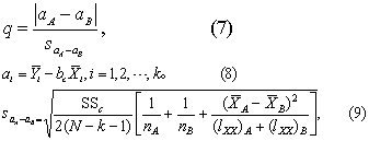 各b值由大至小排列: b3=66.5672,b1=29.6285,b2=22.0619。 表4 各回归系数的两两比较 查q界值表(见条目“多个样本均数间的两两比较”,表1)得P值,见表4。按α=0.05水准拒绝H0,接受H1者在相应的q值右上角记“*”;不拒绝H0者无“*”,故可认为直线3的回归系数大于直线1与2的回归系数; 直线1与直线2的回归系数间无差别。 多个样本截距的两两比较 经假设检验,多个总体截距间有差别,若需进一步作两两比较,亦可用q检验,步骤与多个样本回归系数间的两两比较相同。统计量q值的计算公式为 例3 例1中测得四条直线的截距不等,试作两两比较。 H0: 任两总体A、B的截距相等, H1: 任两总体A、B的截距不等或不全相等。 α=0.05。 由例1资料算得 n=4,bc=14.8895,SSc=194.4481。