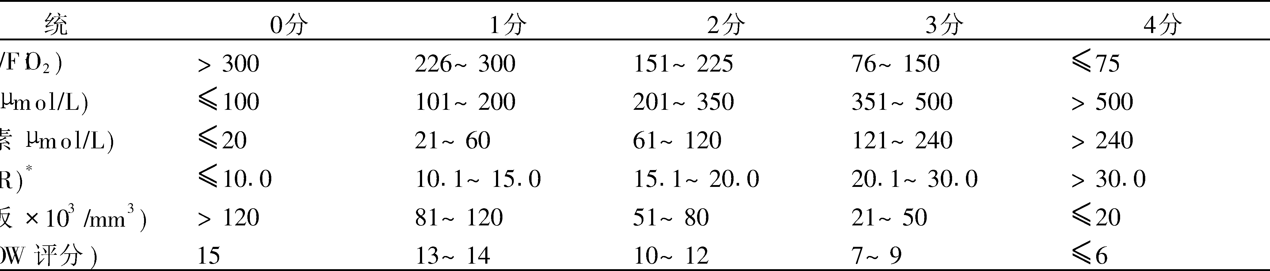 Marshall J C在1995提出以下评分方法判断多器官功能状态。MODS包括6项指标,分别代表心血管、呼吸、肾脏、肝脏、血液、中枢神经系统功能状况。与传统的参数选择不同的是,Marshell等以血压校正的心率(pressure adjusted heart rate,PAR)代表心血管功能状态,从而避免单用血压、心率受治疗因素影响大,且与病死率相关不显著的特点。其余指标分别是PaO2/FiO2比率、血肌酐、胆红素值、血小板计数及GLAS-GOW计分。根据各指标与病死率相关程度,将分值定为0~4分,其中0分对应于病死率<5%或仅有轻微的脏器功能改变;4分对应于病死率>50%或显著的脏器功能损害。各指标总得分反映测评时多器官功能状态,最大值24分。