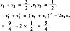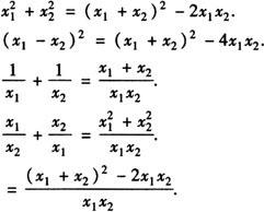 一元二次方程ax2+bx+c=0的两个根x1,x2与系数a,b,c存在如下关系:x1+x2=-b/a,x1·x2=c/a. 注意1.一元二次方程根与系数的关系也称为韦达定理. 2.一元二次方程根与系数关系,有以下几种常见的变形形式.  例1 已知一元二次方程x2-2x-1=0的两个根是x1,x2,则 __,x1-x2=__. 答 6,±2 . [解析] 由根与系数的关系,有x1+x2=2,x1·x2=-1,只要能用x1+x2,x1·x2来表示 ,x1-x2,就可以实现由已知向未知的转化,所以得 . (x1-x2)2=(x1+x2)2-4x1x2=8,即 . 例2 已知方程3x2+2x-11=0的两根分别为x1,x2,则 的值是( ).  答 A. [解析] 由根与系数关系,有  故选A. 例3 若x1,x2是一元二次方程2x2-3x+ 1=0的两个根,则 的值是__.  [解析] 由根与系数关系,有  例4 已知一元二次方程x2+3x+1=0的两个根x1,x2,那么(1+x1)(1+x2)的值等于__. 答 -1. [解析] 由根与系数的关系: x1+x2=-3,x1x2=1. ∴(1+x1)(1+x2) =1+x1+x2+x1x2 =1-3+1=-1. |