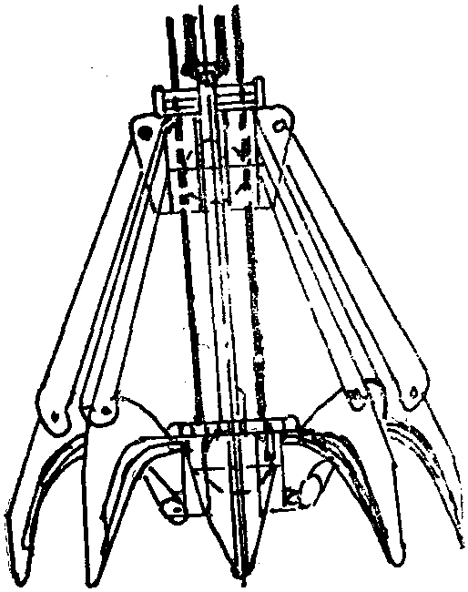 颚板数目多于两块,第一块颚板的刃口成尖形荷花瓣状的抓斗。又称为荷花抓斗。适用于抓取块状物料,如矿石、铝锭、铁属及废钢等。如图示。