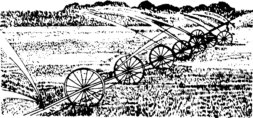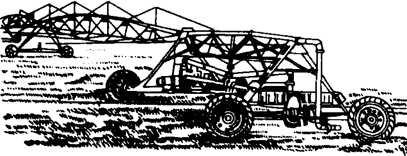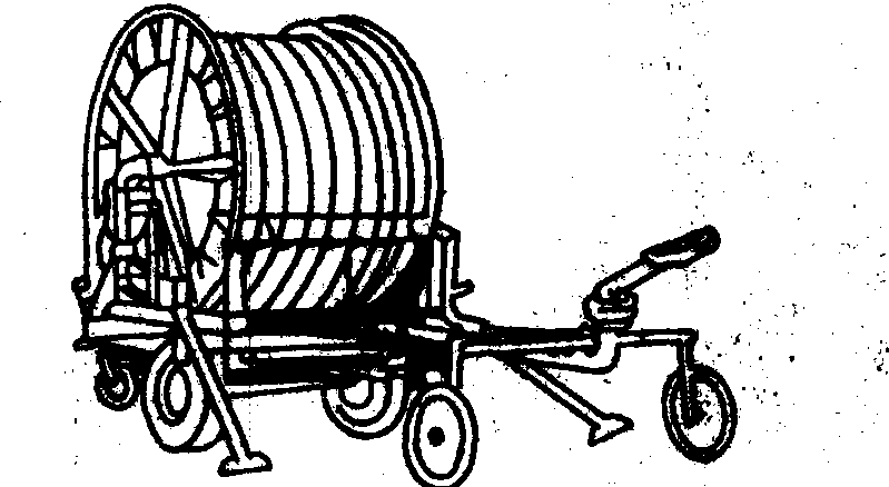 释义 | 大中型喷灌机large and medium-duty sprinkler由动力机、水泵、管道、喷头、行走机构、控制系统以一定形式组合起来的宽幅式喷灌机具。配套动力11~40千瓦为中型喷灌机,40千瓦以上的为大型喷灌机。大中型喷灌机单台机组控制喷灌面积较大,机械化和自动化程度较高,适用于大面积农田、草场和劳力紧张地区。 图1 滚轮式喷灌机 端拖式喷灌机 由十几根外径100毫米铝管联接成的400多米长的喷洒管道,利用许多滑橇和轮架支承,每隔12~18米装有竖管、喷头和溢水阀。实行定点喷洒,由拖拉机牵引变换作业地块。 中心支轴式喷灌机 也称圆形喷灌机或时针式喷灌机。1952年美国富兰克·佐巴奇(Frank Zybach)首先获得发明水动圆形喷灌机的专利权。它由中心支座、塔架车、喷洒桁架,未端悬臂和电控同步系统等部分组成。几跨装有喷头的桁架支承在若干个塔架车上,用挠性接头联接,以适应坡地作业。在每个塔架车上又配有水动装置或0.75~1.1千瓦电动机作为行走动力,并配有专用电控同步系统进行同步运行控制,绕着中心支轴旋转,从而实现喷洒支管连续自移喷洒作业,湿润一个圆形面积。世界上最大的圆形喷灌机长803米,转一周能浇灌212公顷土地。中国生产的DYP—415型电动圆形喷灌机长415米,喷水量为220米3/小时,进水压力500千帕,转一周能浇灌土地62公顷,同时还能喷洒化肥和农药。一般喷洒均匀度为85~90%。圆形喷灌机的缺点是,方形地块的四角有漏喷区。为了改善这种状况,常用安装角喷装置或用中小型喷灌机进行补喷。 平移式喷灌机 借助于电动圆形喷灌机的基本结构和电控同步系统,以保持塔架之间的良好对直而平行移动(图2)。1980年出现于美国,它的平移导向系统有两种方法:❶用塔架车上的导向天线接收地埋导线发出的信号,沿地埋线方向平移向前。 ❷采用传感器和钢索进行导向,沿钢索方向平移向前,行喷农田。美国9880型平移式喷灌机,长为792米,配套动力100千瓦,喷水量437米3/小时,前进速度1.98米/分,田块覆盖率达98%,喷洒均匀度为90%以上。 图2 大型平移式喷灌机 平移式和中心支轴式的差别在于喷洒支管自移方式不同,中心支轴式以支管一端为中心回转运动。而平移式喷灌机与供水管呈90°方向平移。 悬挂式远射程喷灌机 水泵由拖拉机通过万向节和单级变速箱带动,把喷枪直接装在水泵出水管上,泵和喷枪悬挂在拖拉机液压机构上。整个装置体积小、结构紧凑,可以定喷或沿水渠行喷。 世界上最大的远射程喷灌机是苏联的海王星一ДДС—1000型,配套动力2 300千瓦,进水压力为1 600千帕,射程275米,工作幅宽550米,泵流量3600米3/小时。 绞盘式喷灌机 利用聚乙烯挠性管输水兼作牵引钢索用的远射程喷灌机(图3)。主要由水泵、绞盘、聚乙烯管、喷枪车、自动调速装置和水力驱动装置等部分组成。当压力水通过水涡轮时驱动绞盘转动,卷绕着聚乙烯管使喷枪车向后走,进行扇形喷洒,形成一条120×445米的矩形湿润带。主要用于牧草、谷物灌溉和矿山除尘。 图3 绞盘式喷灌机 钢索牵引式喷枪车 采用钢索牵引,其后面拖曳着一条涂塑软管输水的远射程喷灌机。作业时,软管一端接上水栓,再借用拖拉机顺着灌区地段将软管卷展开,然后把钢索固定在地头对面的锚桩上。当水源接通后,喷枪车拖曳着软管朝着水栓方向卷起钢索,每次行驶可灌溉0.9~7.6公顷农田。 |