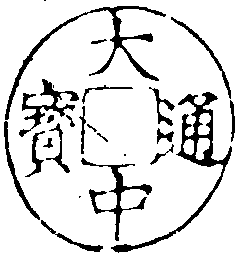 朱元璋爲吳國公及稱吳王時(公元1361—1367年)鑄。分小平、折二、折三、折五、當十共五等,面文真書,直讀。除光背者外,錢背又有記地、記值及記地兼記值三類銘文。記地者有:桂、廣、福、浙、豫、北平、濟、京、鄂共九種;記值僅見“十”字一種。記地兼記值有:桂一、桂二、桂三、桂五、桂十、廣二、廣三、廣五、廣十、二福、三福、十福、北平十、濟十、京十、鄂十、十豫、十浙等。一般小平徑二·三至二·五厘米,重三至三·六克;折十徑四·二至四·六厘米,重二十八至三十六克。《明史·食貨志五》:“太祖初置寳源局於應天,鑄‘大中通寳’錢,與歷代錢兼行。以四百文爲一貫,四十文爲一兩,四文爲一錢。及平陳友諒,命江西行省置貨泉局,頒大中通寳錢,大小五等錢式。”《續文獻通考·錢幣五》:“先是,辛丑歲二月,置寳源局於應天府,鑄‘大中通寳’錢,與歷代錢兼行。以四百文爲一貫,四十文爲一兩,四文爲一錢。設官專管。甲辰歲,江漢既平,乃命江西行省置貨泉局,頒大中通寳大小五等錢式,使鑄之。”