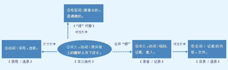 字源解说 本 字 “录” “录”是“渌”(异体字“漉”)的本字。录,甲骨文 上部像井架上的汲水辘轳 ,下部“西” 像装水的袋子,字形表示用辘轳和水袋从井里打水。有的甲骨文 将水袋 写成装满水的形状 ,水袋 中的一点指事符号 表示袋中有水, 表示湿漉漉的水袋底部淌滴着水滴 。造字本义:用辘轳和水袋从井下汲水。金文 将三点 写成六 点,明确了“汲水”的主题,并加 (即 ,两个“又”),表示双手操作。有的金文 简化字形,将甲骨文字形中的滴水袋子 写成 。篆文 将金文字形中的辘轳形状 写成费解的 ,将金文字形中滴水袋子 写成晦涩的 。楷书 在篆文字形 的基础上有所简化。俗体楷书另造会义字: = (彐,“又”的变形,操持)+ (水),表示打水。当“录”的引申义“湿漉漉”消失后,篆文再加“水”另造“渌”(异体字“漉”)代替。 合并字 “録” 录,既是声旁也是形旁,表示选取。録,篆文 = (金,铭刻)+ (录,选取),表示选择信息加刻记。造字本义:选择反映历史的重要信息,铭刻在祭祀的钟鼎上。 彔 文言版《説文解字》:彔,刻木彔彔也。象形。 彔 白话版《说文解字》:录,刻木录录的样子。象形。 錄 文言版《説文解字》:錄,金色也。从金,录聲。 録 白话版《说文解字》:録,金色。字形采用“金”作边旁,采用“录”作声旁。 引申线索
