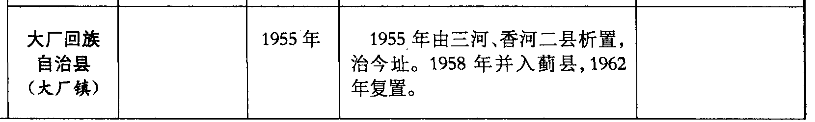 大厂回族自治县(大厂镇)1955年1955年由三河、香河二县析置,治今址。1958年并入蓟县,1962年复置。