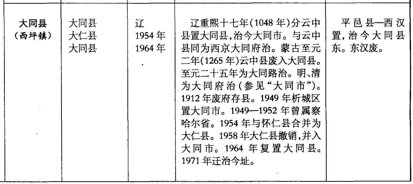 大同县(西坪镇)大同县大仁县大同县辽1954年1964年辽重熙十七年(1048年)分云中县置大同县,治今大同市。与云中县同为西京大同府治。蒙古至元二年(1265年)云中县废入大同县。至元二十五年为大同路治。明、清为大同府治(参见“大同市”)。1912年废府存县。1949年析城区置大同市。1949—1952年曾属察哈尔省。1954年与怀仁县合并为大仁县。1958年大仁县撤销,并入大同市。1964年复置大同县。1971年迁治今址。平邑县—西汉置,治今大同县东。东汉废。