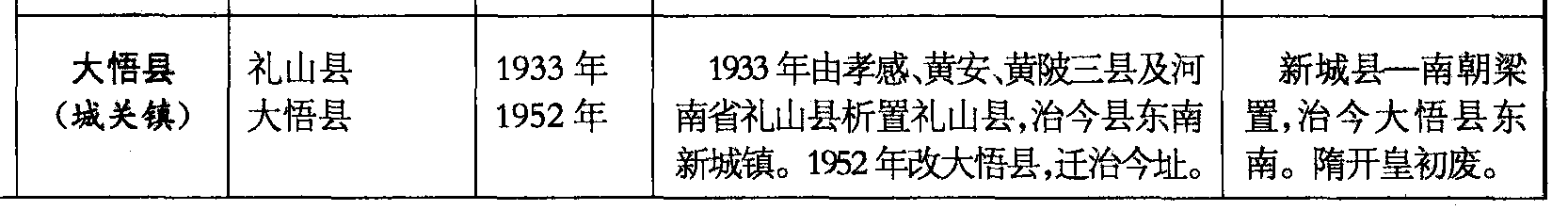 大悟县(城关镇)礼山县大悟县1933年1952年1933年由孝感、黄安、黄陂三县及河南省礼山县析置礼山县,治今县东南新城镇。1952年改大悟县,迁治今址。新城县—南朝梁置,治今大悟县东南。隋开皇初废。
