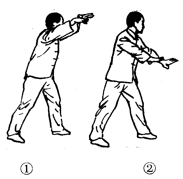 大成拳的基本拳法之一。为前扑下劈的动作。预备式为左技击桩。动作过程:向前扑击时右腿蹬地使身体重心移至前脚,同时上体向左拧转,两臂随身体前移抬起,两掌沿弧线向前上方扑出。(图2—4—85—