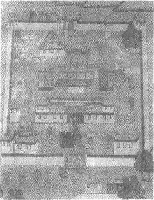清。纵117厘米,横98厘米。西藏自治区拉萨市布达拉宫白宫大门外侧壁画。公元七世纪中叶松赞干布为弘扬佛教建造的大昭寺,安放了唐朝文成公主和尼泊尔尺尊公主带来的佛像。此图以俯视的角度表现了大昭寺落成的状况。图中的主体建筑兼具藏、汉、尼风格,四周围高墙,并有角楼。主殿高大、宽敞,供奉释迦牟尼像,左侧殿内供奉11面观音像,右侧殿内供不动金刚身释迦像。院内西侧有石塔一座。寺内有僧人和俗人漫游、礼佛,寺外人们在欢乐地奏乐、舞蹈,表达了大昭寺建成后他们的喜悦心情。全图以黄色为基调,极力渲染了浓厚的宗教气氛,具有典型的藏族佛教艺术风格。