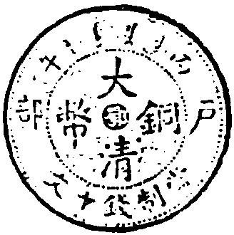 释义 | 古代名物 > 貨幣類 > 銅鐵錢部 > 清 > 大清銅幣 大清銅幣 dàqīngtóngbì 清末機製銅板。光緒三十一年(公元1905年)清廷户部始造,後各省倣效。形制基本一致,不類“光緒元寳銅元”版别之雜。正面居中“大清銅幣”四字,四周上端滿文,下端漢字作“當制錢若干”,兩旁作“户部”二字,滿文兩邊作漢字干支,表明鑄造年份。背面中作龍紋,四周英文Tai-Ching Ti-Kuo·Copper(大清帝國銅幣)及中文“光緒年造”或“宣統年造”字樣。其爲各省所造者則於正面“大清銅幣”内鎸一小字代表省名,偶有用二字者。宣統三年(公元1911年)所鑄者,另有一種式樣:“大清銅幣”在背蟠龍紋四周,正面則作嘉禾花紋,四周爲“宣統三年”及百枚换銀幣若干字樣。參見本類“銅元”。 大清銅幣 |