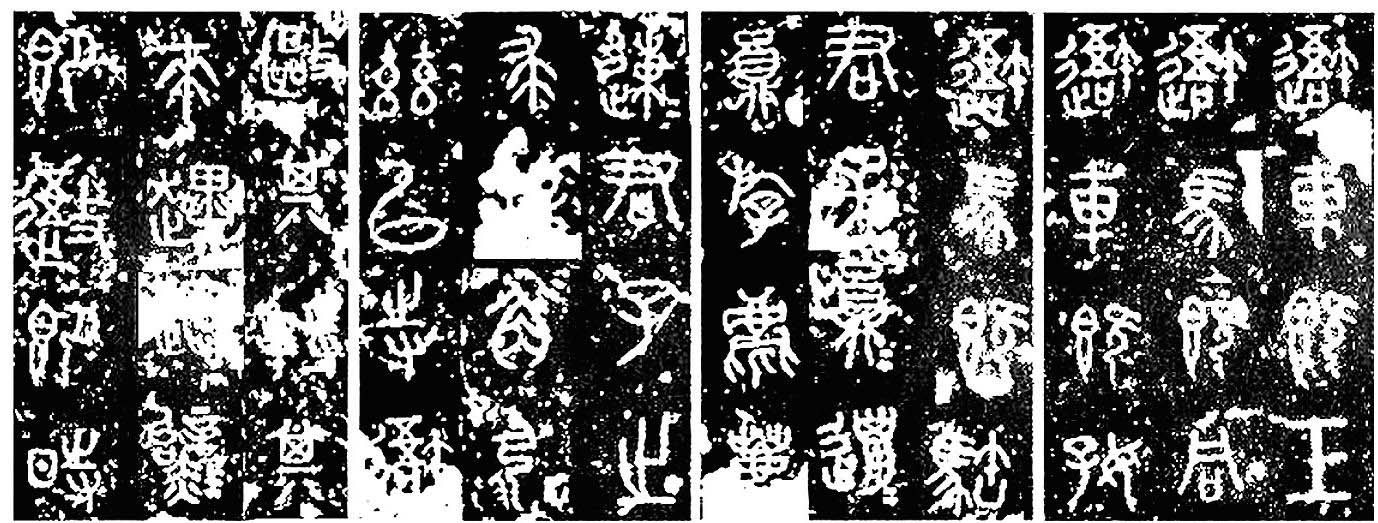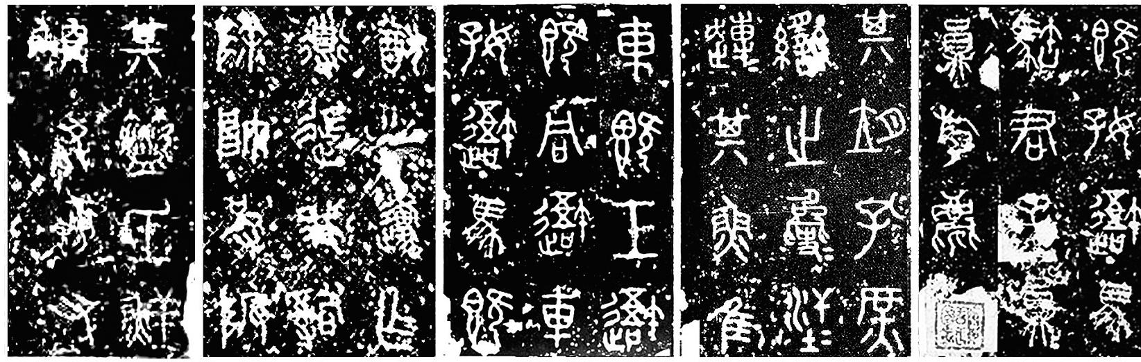 战国时期的大篆碑文拓片 小篆出现于秦始皇统一天下后。公元前221年,在秦始皇要求的“书同文”政策下,李斯奉命在原来使用的大篆籀文的基础上简化文字。他取消了其他六国的文字,创制出一种新的文字形式——秦文。秦文沿袭了西周的文化传统,在大篆的基础上发展起来,又称“秦篆”。后人将其称为“小篆”以与“大篆”区别。 从书写工具来看,青铜器比兽骨更易保存但过于笨重,而石头、玉器便于携带摆放,更适合被人们用来当作书写载体。虽然仍有古人把文字刻在青铜器上,但此类文字却越来越少,写在石材上的文字则是越来越多。我们把铭铜、雕玉、刻石等书写方式都称作为“篆刻”。较文字统一前出现异形、写法多样、结构不一的大篆而言,小篆在外形和结构上更趋近于整齐划一。 被刻在十个鼓形石块上的“石鼓文”,是留传后世的大篆中保存得比较完整且字数较多的书迹之一。“石鼓”于唐代初出土于天兴三畴原(今陕西省宝鸡市凤翔三畴原),五代战乱期散落于民间,到宋朝才得以聚齐。“石鼓文”是战国时期秦国的石刻字,记述了秦国国君游猎的情况,是我国遗存至今时间最早和最具代表性的石刻文字,有“石刻之祖”的尊称。“石鼓文”在字体上连接了西周的钟鼎文和秦代的小篆,是学习篆书的重要范本,被誉为“书家第一法则”,具有很高的文史和艺术收藏价值。
