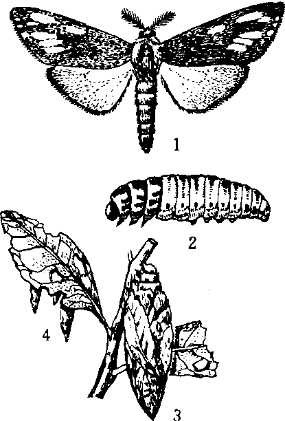 释义 | 大蓑蛾见蓑蛾。 大蓑蛾large bagwormClania variegata Snellen,又称大窠蓑蛾、大袋蛾、大背袋蛾。鳞翅目,蓑蛾科。分布于华东、华南、西南等地;日本、印度、马来西亚也有分布。多食性,为害多种木本植物及棉花。雄蛾褐色,翅展35~44 mm,前翅翅脉暗褐,外缘有5个半透明斑。雌蛾蛆状无翅。老熟幼虫雌性肥大,体长25~40 mm,头赤褐,胸背灰黄褐色,中线黄,两侧有赤褐色纵斑,腹部乌褐多横皱。雄幼虫体长17~24 mm,头黄褐,中央有白色“人”字纹,胸部灰黄褐色,背侧有赤褐色纵斑,腹部灰黄褐色。护囊纺锤形,长50~70 mm,丝质坚实,贴附碎叶。年发生1代,以老熟幼虫封囊越冬。除雄蛾外,各虫态均在囊内,幼虫负囊爬行食叶。可采取摘除虫囊,喷施青虫菌或化学农药等防治措施。 大蓑蛾 1.雄成虫 2. 幼虫3. 蓑囊 4. 为害状 |