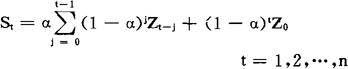 一种常用的预测方法,是移动平均数方法的改型。 它既具备移动平均数方法的长处,又可以减少数据的存储量。包括离散时间系列指数平滑法和连续时间系列指数平滑法。 设Z0,Z1,…,Zn为离散时间系列的观测值或给定数值,各观测值相对应的时间依次为t=0,1,…n;又设S1,S2,…Sn依次为时间t=1,2,…n时各观测值的修匀值(或称平滑值)。则各个修匀值St是利用下式求得: St=Zt-1+α(Zt-Zt-1),t=1,2,…,n 其中St称为指数平滑平均数;α是一个介于0与1之间的常数,称为平滑常数。 把上式改写为: St=αZt+(1-α)Zt-1,t=1,2,…,n 则可看出,St是Zt和Zt-1的加权平均数,其权数分别为α与(1-α)。如果进行递推,可得  指数平滑法实际上是一种特殊的加权平均法。 由于这种特殊权数均呈j的指数函数形式,且此平均法具有修匀或平滑一系列观测值或给定数列之功能,故得指数平滑法之名称。 如果给定的时间系列Z(t)是由连续观测值或连续数值构成,则可令t为一系列离散时间值,代入Z(t)中,求得一系列离散观测值后,再用上述离散时间系列指数平滑公式来计算。也可采用下列处理办法: 仿照离散指数平滑法的定义,得时间为t的指数平滑平均数Y(t)为 Y(t)=αZ(t)+(1-α)Y(t-1) t=1,2,…,n,0<α<1  令t的相邻两数值之间隔为△t,则上式变为  式中r为平滑常数,主动作用类似α,但它的允许变化范围并不在0与1之间,而是在0<γ<∞之间。 令△t→0,则上式变为  对上式进行积分,且时间t=T时,0的连续指数平滑平均数为  式中,C为积分常数。 |