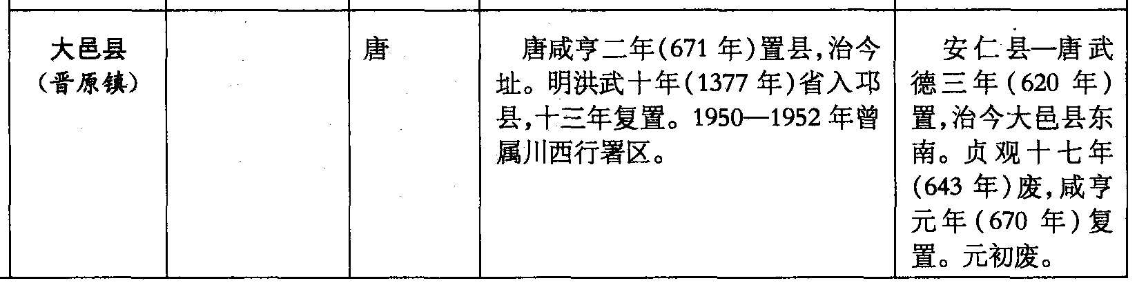 大邑县(晋原镇)唐唐咸亨二年(671年)置县,治今址。明洪武十年(1377年)省入邛县,十三年复置。1950—1952年曾属川西行署区。安仁县—唐武德三年(620年)置,治今大邑县东南。贞观十七年(643年)废,咸亨元年(670年)复置。元初废。