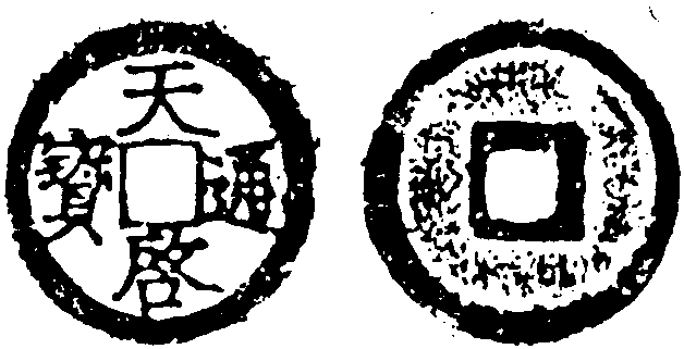 明熹宗天啟年間(公元1621—1627年)鑄。有小平、折二、當十凡三等,面文真書,直讀。小平背文甚雜,可見户、工、京、浙、密、云、鎮、院、新、壹錢、一錢、一錢一分、一錢二分、新·一錢一分以及奉旨等多種,亦有光背、背星及背月諸品。折二種類較少,鑄量亦稀,僅見背穿上星、穿上“浙”及上“二”下星者三種。折十制倣洪武,除光背、背穿上“十”及上“十”右“一兩”者外,又有背銘“密”、“鎮”、“府”字樣者,分别由密雲、薊鎮、宣府所鑄。一般小平徑二·四至二·六厘米,重三克上下;折十徑四·四至四·六厘米,重二十至三十克。《明史·食貨志五》:“自啟、禎新鑄出,舊錢悉棄置。然日以惡薄,大半雜鉛砂,百不盈寸,捽擲輒破碎。”又“啟、禎時廣鑄錢,始括古錢以充廢銅,民間市易亦擯不用矣。”《續文獻通考·錢幣五》:“熹宗天啟元年二月,頒天啟錢式。至明年三月,工部進鑄成天啟錢一百萬文。”