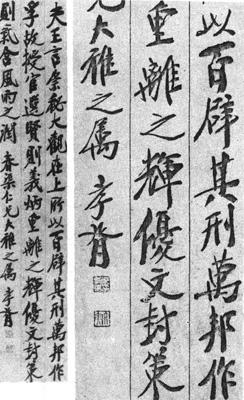【简介】: 近代·郑孝胥书。纸本。行书。三行。刊于《明淸书道图说》。 【赏析】: 郑孝胥是中国近、现代史上不光彩的保皇死党,汉奸政客,但其书法功力匪浅,他的书法自成一种面貌。总的来说,他与康有爲、梁啓超,等倡碑学派大有共通之处,取法《石门铭》,横、竪、撇、捺大气磅礴,气势开张,多有隷意。如条幅中第一行“上”字,“其”字的横,完全取隷势,另外,许多字其捺的“波脚”都取隷意,如第二行中“之”字、“优”字、“文”字、“策”字的捺全是隷意,只是不铺毫而已,翘尾全是隷书之意。还有,书中的横折多取锐角硬折,如“万”、“离”、“辉”、“策”等字比比皆是。由于字体狭长,加上竪画粗重,横画隷意,转折中锐角参差,使他的字爽利痛快,饶有气势,如说不足处大致上在波挑中有轻佻之处,如几个“之”字便是,然而就整体来看还是气势雄强。