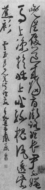 释义 | 七绝诗轴 【简介】: 明·周天球书。纸本。草书。凡三行,共四十三字。刊于日本靑山杉雨编《明淸书道图说》。 【赏析】: 这幅草书七绝诗轴,取法文徵明的行草书。中锋行笔,苍劲浑厚,气势连绵,如行云流水,给人以强烈的韵律感和节奏感,充分体现了作者对墨笔技巧的驾驭能力。同时又可看到,此幅诗轴尽管随意挥洒,变化多端,却又法度具备。最明显的是,线条旣圆转洒脱,刚劲挺健,又富有古韵,从而有机地与这首七绝诗内容相统一,把人们引向诗一般的境地。 |
