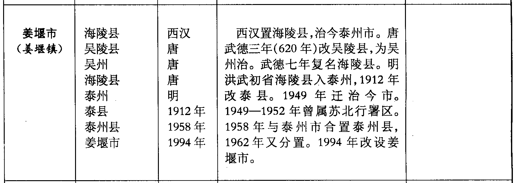 姜堰市(姜堰镇)海陵县吴陵县吴州海陵县泰州泰县泰州县姜堰市西汉唐唐唐明1912年1958年1994年西汉置海陵县,治今泰州市。唐武德三年(620年)改吴陵县,为吴州治。武德七年复名海陵县。明洪武初省海陵县入泰州,1912年改泰县。1949年迁治今市。1949—1952年曾属苏北行署区。1958年与泰州市合置泰州县,1962年又分置。1994年改设姜堰市。