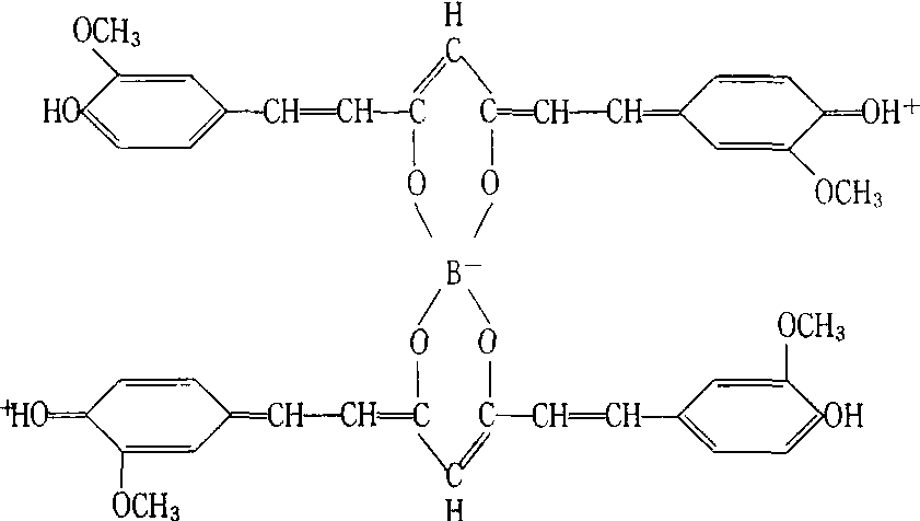 姜黄素比色法curcumine colorimetric method利用硼与姜黄素作用生成玫瑰红色的玫瑰花青苷的反应测定硼的一种比色方法。姜黄素又称姜黄或郁金黄(curcumine)其化学式C21H20O6,以酮型和烯醇型存在。在酸性介质中姜黄素与硼结合成玫瑰红色的络合物,即玫瑰花青苷(rosocyanim),它是两个姜黄素分子和一个硼原子络合而成:  该络合物检出硼的灵敏度是所有比色测定硼的方法中最高的(摩尔吸收系数ε550=1.80×105),最大吸收峰在550 nm处,溶液在0.0014~0.06 mg/kgB的浓度范围内符合Beer定律。在比色测定B时,应严格控制显色条件,以保证络合物的形成。该络合物溶于酒精后,在室温下1~2h内稳定。 |