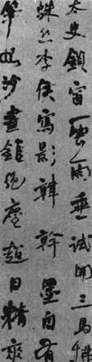 【简介】: 淸·何绍基书。纸本。行书。凡四幅,每幅三行。刊于日本《综合书道大辞典》。 【赏析】: 此帧行书自作七言诗四屏之一,信手涂抹,点画狼藉,当是道州晚年人书俱老,炉火纯靑之作。 道州作书,纯以神行,不以分布爲工。字行之间,疏密起落若天花乱坠。其“韩”、“干”二字虽疏阔至极而神气还连,的是高手用斤。 道州结字,险峻茂密,每见生动于欹侧之中。“云”、“绝”、“尘”等字最见恣肆宕逸。  道州病腕,因此执笔异于人。某冬其临《张黑女》后题有:“每一临写必迴腕高悬,通身力到,方能成字……”,故其用笔能圆转空灵。如“有”、“锥”、“超”等字,落笔跳跃飞动,秀韵天成:“锁”、“笔”、“精”等字,则方圆交错,粗细相间,极尽变化。道州用笔,还时有篆分笔法杂其间,如“拂”之长竪,“墨”之右点,“锥”之长撇尤见篆、分意。 |
