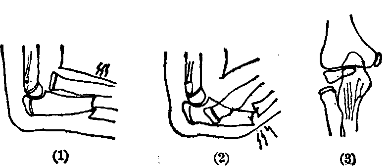 ❷屈曲型:极为少见。桡骨头向后外方滑脱,尺骨骨折亦随之向背侧、桡侧成角。