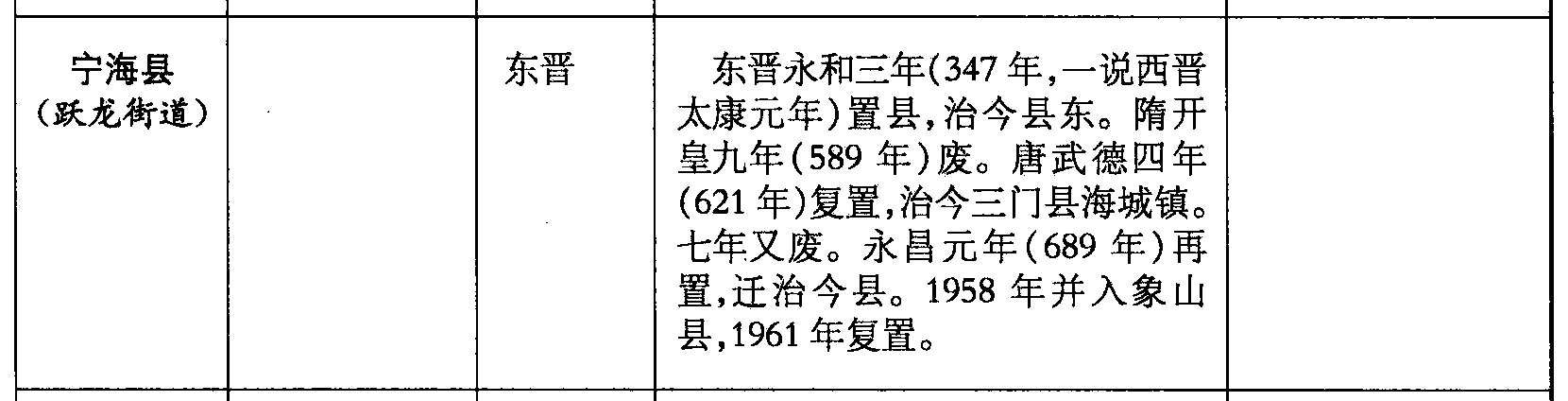 宁海县(跃龙街道)东晋东晋永和三年(347年,一说西晋太康元年)置县,治今县东。隋开皇九年(589年)废。唐武德四年(621年)复置,治今三门县海城镇。七年又废。永昌元年(689年)再置,迁治今县。1958年并入象山县,1961年复置。