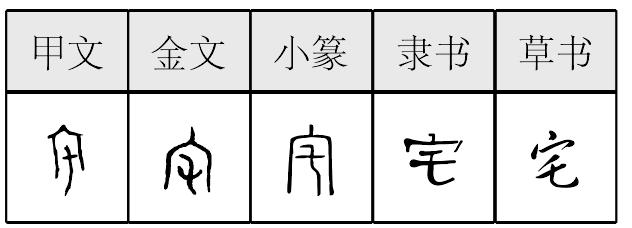 【提示】乇,起笔是撇,不是横。 *宅zhái6画 宀部 住所: ~院|住~|家~|深~大院。 宅 ☚ 家 室 ☛ 宅zhái甲骨文金文和小篆隶楷从宀(mián,房屋形),乇(zhé,《说文》说是草带穗形)声。宅原读zhè,后再演变读zhái。韵变如责债、择(zé)又读zhái、侧(cè)又读zhāi例。本是建筑房屋义。作为动词。如:宅东寝(见甲骨文卜辞)|幂[mì,覆盖义。原从冂(mì)从鼎]宅禹迹(即在广大中国内建国。见春秋金文)。转为名词,指住所。 宅★常◎常