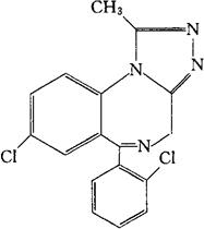 C17H12Cl2N4=343.21 CAS-28911-01-5 8-氯-6-(2-氯苯)-1-甲基-4H-[1,2,4]三唑并[4,3-a]苯并二氮 。 4H-[1,2,4]Triazolo[4,3-a]benzodiazepine,8-chloro-6-(2-chlorophenyl)-1-methyl-. 8-氯-(6-邻氯苯基)-1-甲基-4H-S-三唑并[4,3-a][1,4]苯并二氮杂 。 8-Chloro-6(o-chlorophenyl)-1-methyl-4H-s-triazolo[4,3-a][1,4]benzodiazepine. 催眠镇静药。 Halcion,Triazolam,Clorazolam,Halcion,Insomnium,Novidorm,Nuctane,Somese,Songar,U33030. INN,BAN,DCF,DCIT,JAN,NFN,USAN,USP,MI.  |