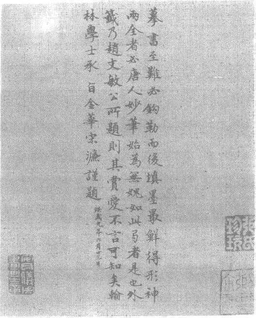明。纸本。北京故宫博物院藏。宋濂(元武宗至大三年—明洪武十四年,即公元1310—1381年),字景濂,号潜溪,又号玄真子,祖居浙江金华,迁浦江。曾受于吴莱、柳贯、黄溍。元至正九年(公元1349年)授翰林编修,不赴任,隐居龙门山,著书历经十余年。洪武二年(公元1369年)召修元史,充任总裁官。洪武九年(公元1376年)官翰林学士承旨知制诰。对当时的礼乐制度,多所裁定,推为开国文臣之首。洪武十三年(公元1380年)坐胡惟庸案,谪茂州道,病卒。著《宋学士文集》。此幅作品,是宋濂为传唐虞世南所摹《兰亭序帖》书的题跋:“摹书至难,必钩勒而后填墨,最鲜得形神两全者,必唐人妙笔始为无愧,如此卷者是也,外签乃赵文敏公所题,则其赏爱不言可知矣。翰林学士承旨金华宋濂谨题。洪武九年六月廿三日。”正楷书,清劲端雅,有晋唐人风韵。是宋氏楷书精品,开后来的“台阁体”书法先风。