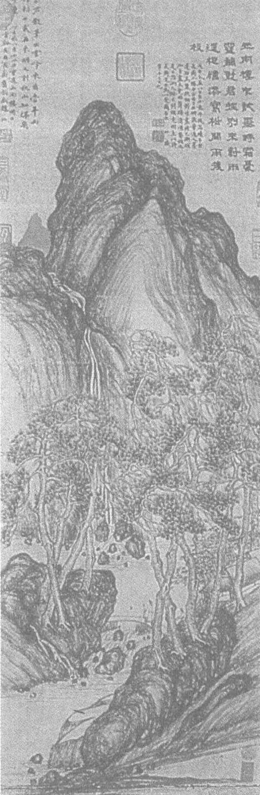 释义 | 宋珏山楼对雨图轴 宋珏山楼对雨图轴明。宋珏绘。纸本水墨。纵82.5厘米,横27.4厘米。北京故宫博物院藏。宋珏(公元1576—1632年),字比珏,号荔枝仙,福建莆田人,侨居南京。他是一位书画篆刻无所不能的多面手。此幅描绘了雨后山涧景致:尚留着雨水冲刷痕迹的远岫近坡,丝丝缕缕的细流间透着一股清新洁爽之气。溪水打着旋儿,喧闹地迎接着高山落泉。溪边岩间的松柏,舞动枝条仿佛要抖落着身上的雨滴。临水的茅舍中走出二人,他们步上流水跌荡的木桥在观赏雨后的景致。画的右上角有作者自题“山雨楼中试墨时,霜豪雪茧对君披,别来对雨遥相忆,添写松间雨后枝。戊申冬孟八日有雨意,午后忽晴,予坐长蘅小楼中,出古子石研,试叶人墨,遂拈高丽纸相对作画,时已渐暝,而予画未竟,因携归清凉庵补之。是日忽雨,人迹不到,补竟,因系以诗,长蘅见之,为一莞尔否。宋珏识事,十三日也。”下钤<比玉>朱文印,<宋珏之印>白文印各一方。左上角有题识“别君数笔出云峰,来看当年雨里松,十载再来明又别,秋山知隔几千重。丁巳秋八月十一日,重过山雨楼,明日之青溪矣,同长蘅旧韵戏题。珏。”下钤白文<宋珏之印>一方。图上还有鉴藏印多方,其中包括<嘉庆御览之宝>、 <三希堂精鉴玺>等。此图气韵生动,笔墨燥润自然,画风清秀,题诗及跋不仅提供了宋珏与李流芳诗画友谊的资料,且为画面增添了新意,是一幅诗、书、画三合一的佳作。 ☚ 李流芳仿北苑山水图轴 卞文瑜一梧轩图轴 ☛ |