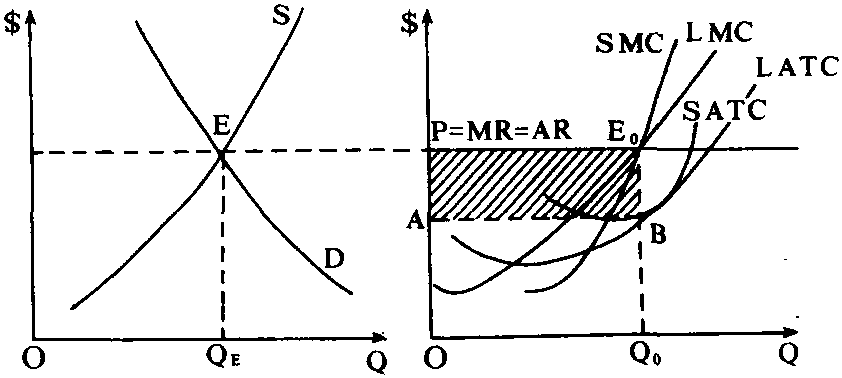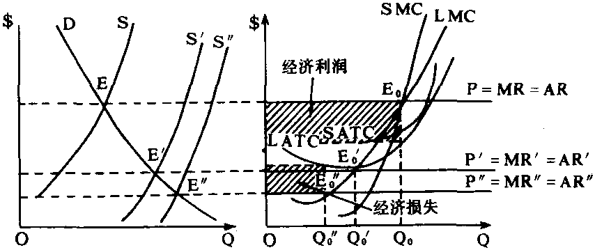 释义 | 完全竞争厂商的长期均衡LongRun Equilibrium of Firm in Perfect Competition Market在短期,各个厂商的短期成本结构不同,使它们达到均衡(利润最大或损失最小)时的利润情况也不同;但在长期,厂商可任意调整规模,可自由进出市场。然而,长期中的厂商仍然要遵循最大利润条件进行生产,因此必然选择LMC(长期边际成本)=MR=P的产量进行生产。同时,厂商的规模调整是指对生产要素进行最佳配置,即LMC=SMC(短期边际成本)。以经济利润为正、且利润水平一般的代表性厂商,可以说明长期均衡的实现过程(如图1)。 图1 具有代表性的厂商获取了正的经济利润 图1中的SATC是短期平均成本,LATC是长期平均成本(这两条成本曲线和SMC、LMC曲线以及它们之间的关系参见“长期的成本分析”条)。在市场价格为P时,选择LMC=MR=P的产量进行生产,意味着最大利润产量为Q0,此时厂商拥有正的经济利润,也称超额利润,即图1上的斜线方块APE0B。这种较高的投资收益率诱使新的厂商加入该行业,增加了市场的供给,从而降低了市场价格 (如图2)。从图2可以看出,由于新厂商的加入,使该行业的供给由S增加到S′,价格亦降至P′,迫使代表性厂商的产量减至Q0′,这时的经济利润为零。如果新厂商继续加入,就会使供给进一步增至S″,代表性厂商的产量也减至Q″0,经济利润为负。这就是通常所说的恶性竞争,因此厂商的数目必须减少,直到供给恢复到S′水平。