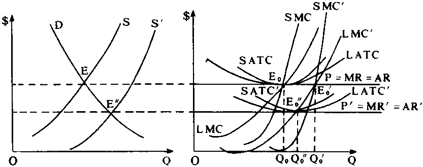 另外,降低成本水平可以使厂商本身扩大生产规模(如图3)。从图3可以看出,当厂商的诸成本曲线分别由SATC、LATC、SMC和LMC降至SATC′、LATC′、SMC′和LMC′时,厂商的产量便从Q0增至Q′0,且有正的经济利润。但当各个厂商的产量均增加时,同样会增加市场的供给,由S增至S′,从而使市场价格由P降低至P′,使经济利润为零为止。这时厂商的产量也必须降至Q″0。通常,产量的增加使生产要素在不增加供给的情况下,价格上升,这会使诸成本曲线抬高,因此该行业内的厂商要么会减少数目,要么将降低产量。 图3 降低成本可使厂商扩大规模,增加产量 总之,上述过程必将持续到经济利润为零时为止。这一经济利润为零的状态,就是完全竞争市场中厂商达到了长期均衡,即P=LMC=SMC=LATC=SATC=MR=AR。 |