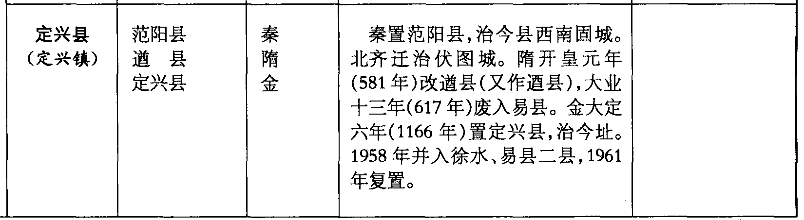 定兴县(定兴镇)范阳县遒县定兴县秦隋金秦置范阳县,治今县西南固城。北齐迁治伏图城。隋开皇元年(581年)改道县(又作逎县),大业十三年(617年)废入易县。金大定六年(1166年)置定兴县,治今址。1958年并入徐水、易县二县,1961年复置。