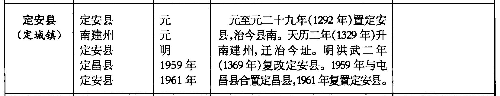 定安县(定城镇)定安县南建州定安县定昌县定安县元元明1959年1961年元至元二十九年(1292年)置定安县,治今县南。天历二年(1329年)升南建州,迁治今址。明洪武二年(1369年)复改定安县。1959年与屯昌县合置定昌县,1961年复置定安县。